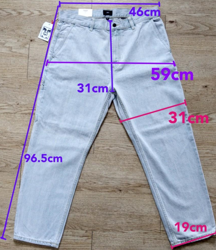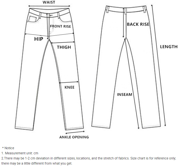 Waist circumference is the most critical place, first relax the jeans flat, pay attention to natural flat, do not deliberately straighten. Measure along the waist top straightness according to the figure below, and multiply the measured length by 2 to get the waist circumference.