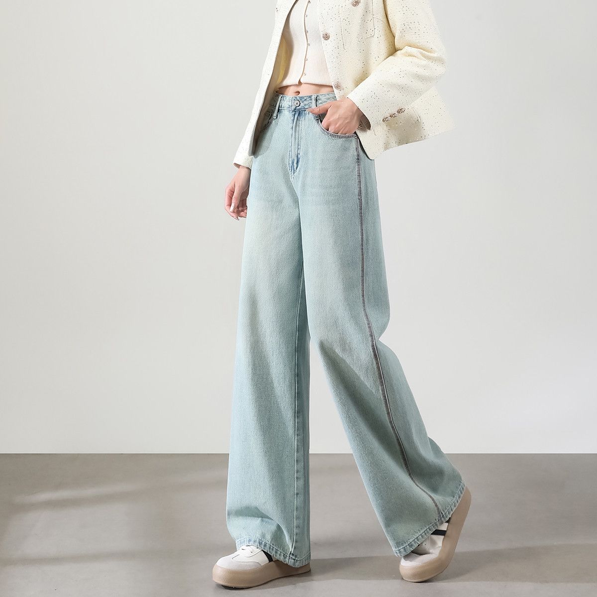 Item Details Product Type Women Jeans Style Korean casual Season Autumn Fabric Cotton denim or cotton-blend denim Fabric Weight Medium weight Fit Type Loose wide leg Waist Design High waist Closure Zipper fly with button Wash Finish Washed, clean surface Color Options Blue, washed blue, light grey Length Full length Sizes XS–2XL Wearing Feel…