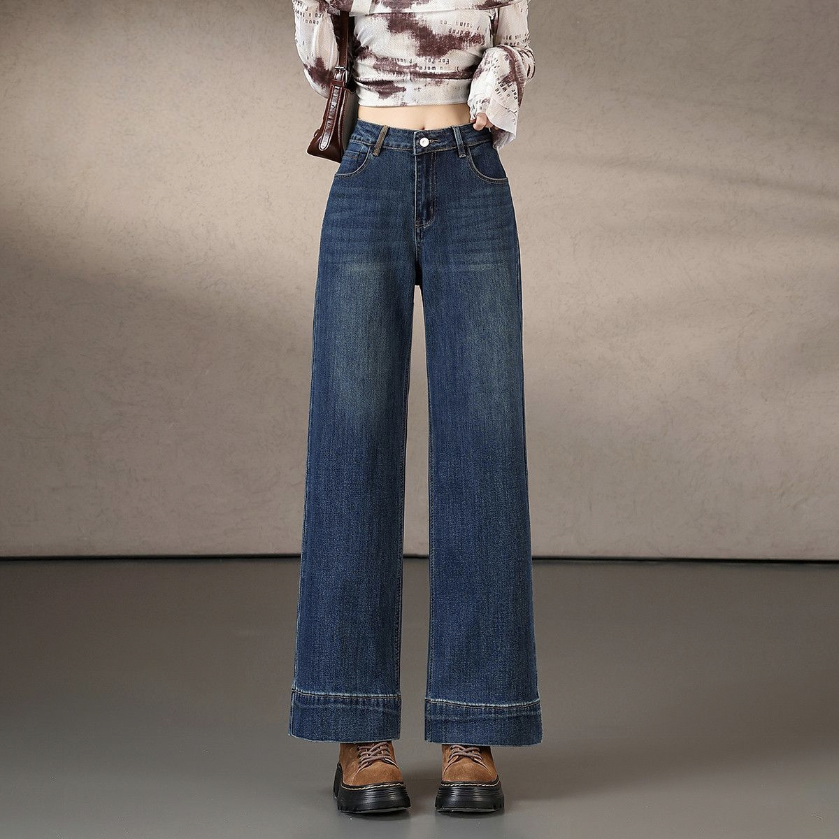 Item Details Product Type Women Jeans Style Vintage, casual Color Dark blue Design Detail Fake layered waistband Season Spring / Autumn Fabric Cotton denim or cotton-blend denim Fabric Weight Medium weight Fit Type Wide leg Waist Design High waist Length Extra long Closure Zipper fly with button Wash Finish Washed, vintage tone Sizes XS–2XL…