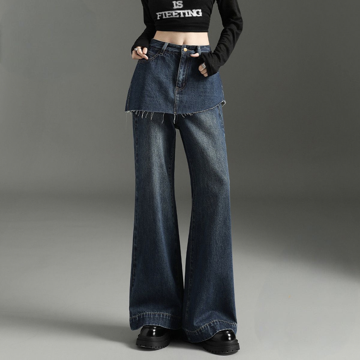 Dark blue vintage fake layered high waist wide leg women jeans