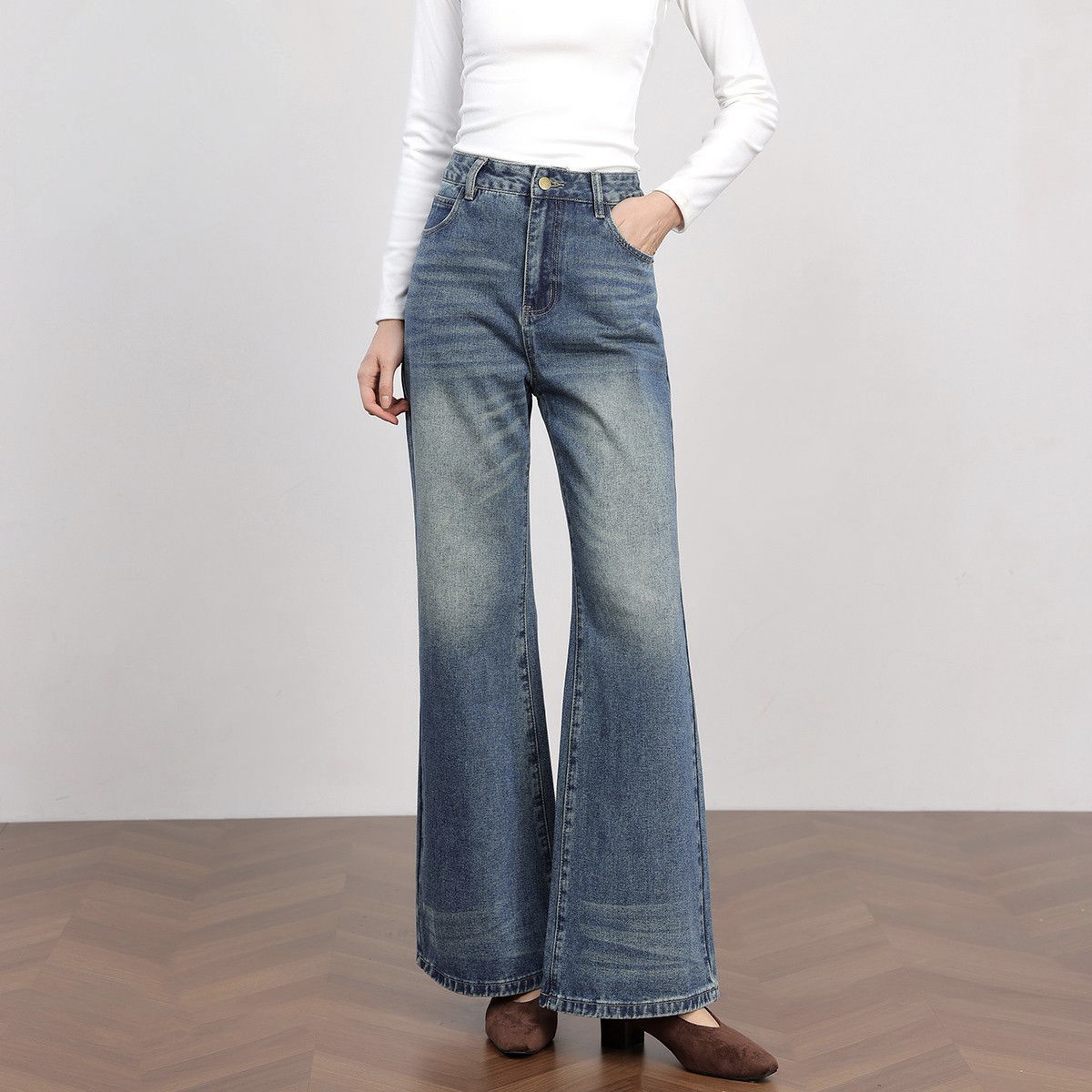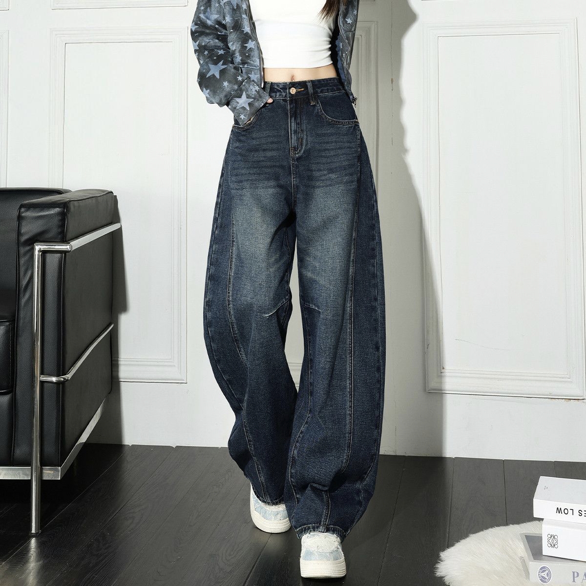 Item Details Product Type Women Jeans Style American vintage, casual Season Spring / Autumn Fabric Cotton denim or cotton-blend denim Fabric Weight Medium weight Fit Type Loose wide leg Waist Design High waist Silhouette Effect Visually slimming Closure Zipper fly with button Wash Finish Washed, soft vintage look Color Options Washed blue, medium blue…