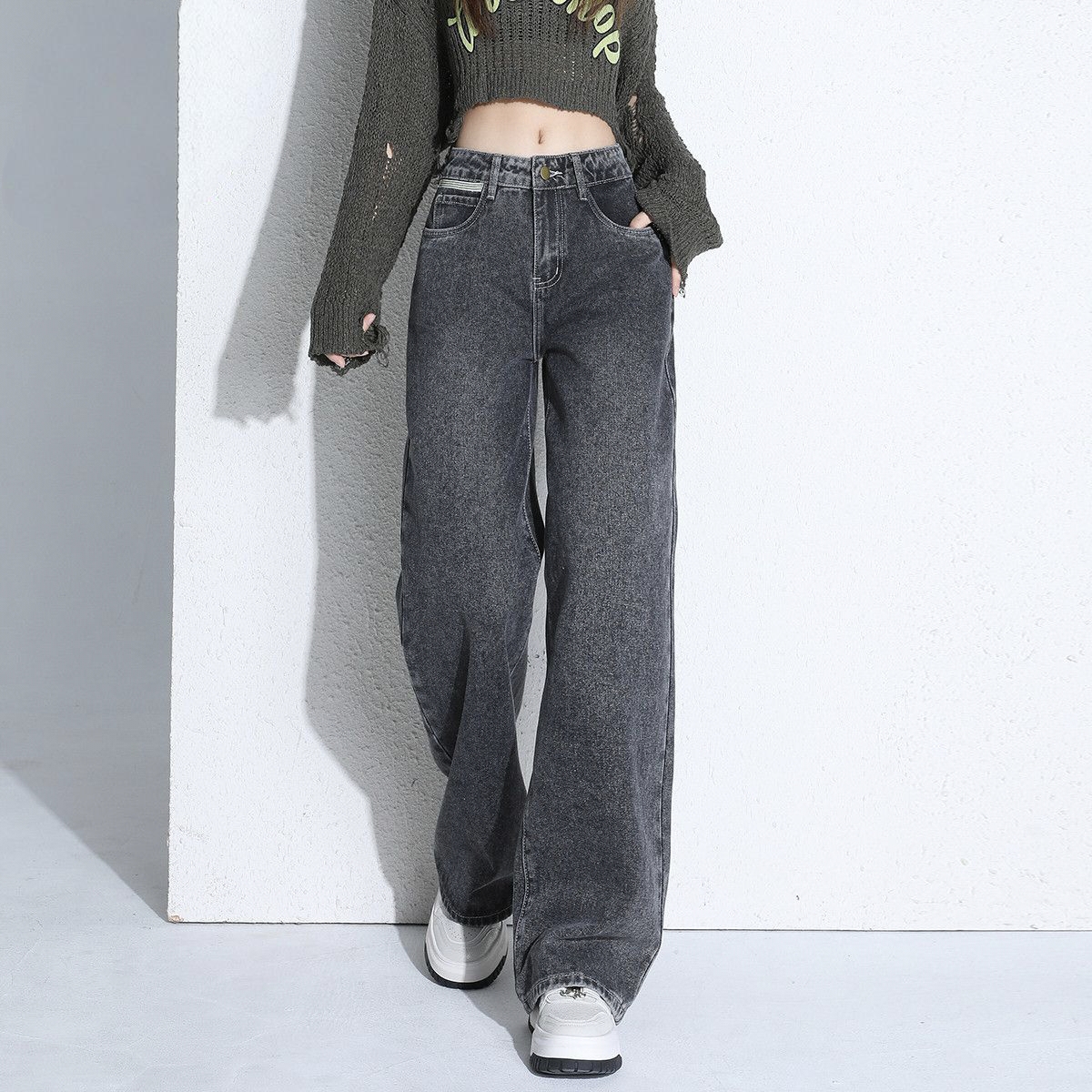 Item Details Product Type Women Jeans Style Korean casual, slimming Season Autumn Fabric Cotton denim or cotton-blend denim Fabric Weight Medium weight Fit Type Loose wide leg Waist Design High waist Silhouette Effect Visually slimming Closure Zipper fly with button Wash Finish Washed, clean surface Color Options Blue, washed blue, light grey Length Full…